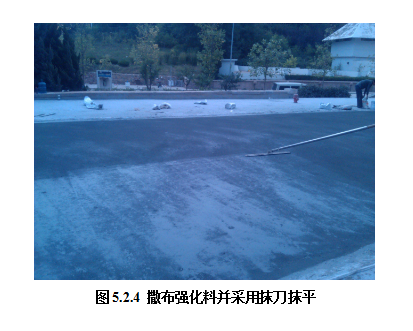 撒布彩色強(qiáng)化劑時(shí)機(jī)的選擇,是本技術(shù)的一個(gè)關(guān)鍵工藝?;炷帘砻嫣珴?,則強(qiáng)化劑撒上去后,大抹刀一磨,強(qiáng)化劑會(huì)被混凝土“吃”掉,必然會(huì)增加強(qiáng)化劑的用量,如水泥表面太硬,則強(qiáng)化劑不易進(jìn)入混凝土內(nèi),不能很好的與混凝土結(jié)合,后期容易出現(xiàn)起皮現(xiàn)象。施工時(shí)用食指在水泥表面輕按一個(gè)凹坑,2分鐘后,水坑內(nèi)有水泌出,則表示太濕,如無水泌出,即可進(jìn)行強(qiáng)化劑的撒布。彩色強(qiáng)化劑以播撒的方式均勻地覆蓋住混凝土表層。