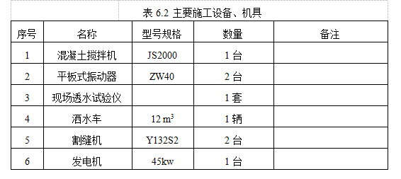 本工法涉及的主要機具包括:混凝土攪拌機、平板式振動器、現(xiàn)場透水試驗儀、割縫機、灑水車、發(fā)電機等(見表6.2),輔助設備包括:直角尺、鋼尺、水準儀等。