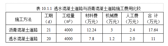 本工法因材料簡單,節(jié)約了大量的材料租賃費、人工費、機械費用,提高了施工質量和施工進度。以紅島片區(qū)大洋一路道路及綜合配套工程自行車道為例,透水混凝土道路與瀝青混凝土道路施工費用對比見表10.1.1,可見透水混凝土道路施工成本較低,施工費用總工節(jié)約了6.64萬元。