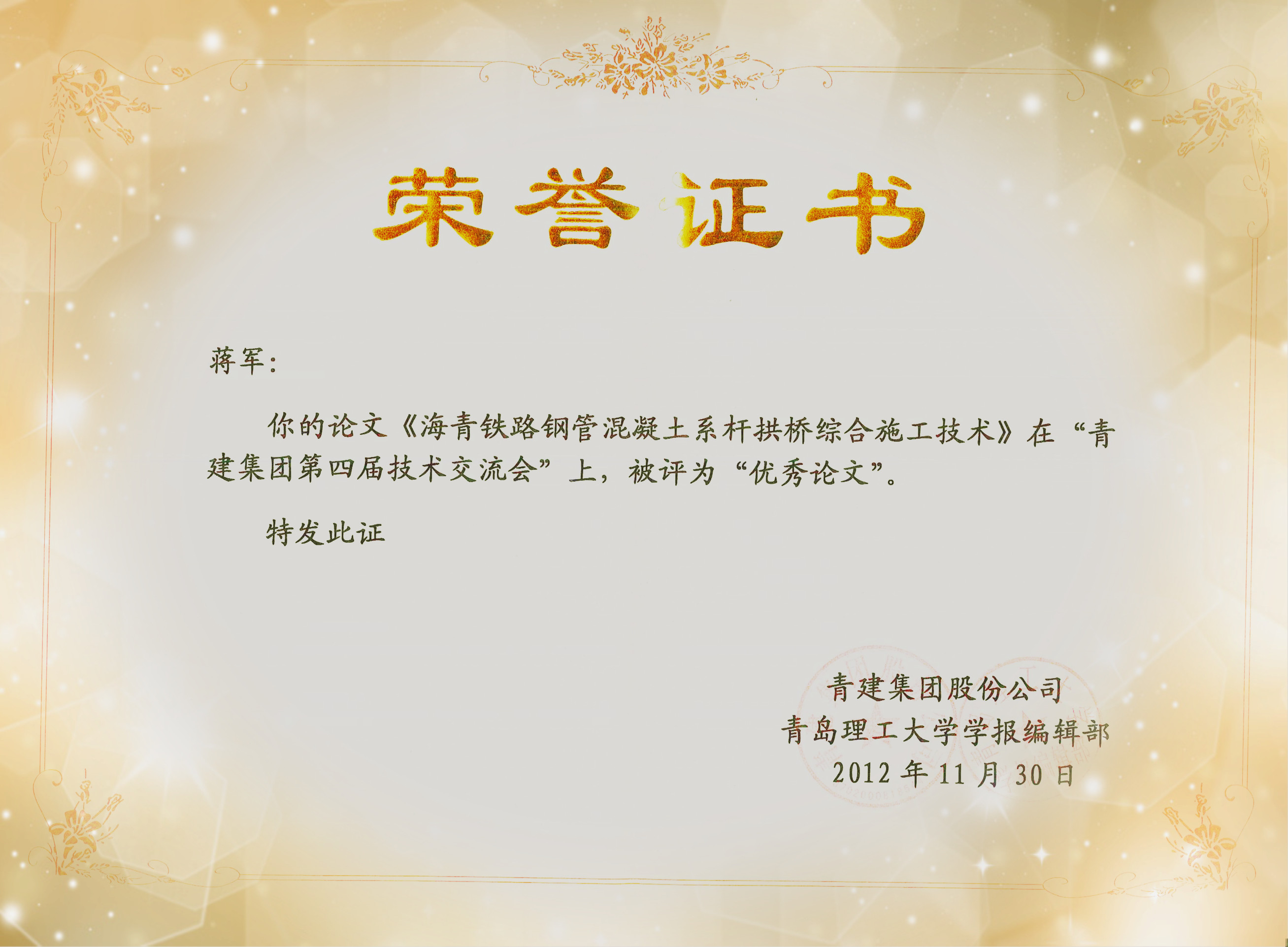 本次交流會議是繼青建集團首屆(2006)、第二屆(2008)、第三屆(2010)技術(shù)交流會成功舉辦之后的又一次技術(shù)盛會,以“交流、創(chuàng)新、合作、共贏”為宗旨,在校企雙方共同交流的基礎(chǔ)上,聘請國內(nèi)知名專家進行專題講座,為廣大科技人員奉獻了一場知識盛宴。本次參會的論文主要是結(jié)合近年來集團各公司及成員單位項目施工過程中的重點、難點技術(shù)總結(jié)完成。共收集論文77篇,評選出優(yōu)秀論文26篇。我公司共提交論文7篇,其中《海青鐵路鋼管混凝土系桿拱橋綜合施工技術(shù)》(作者:蔣軍)、《橋梁內(nèi)箱模板支架設(shè)計與整體安裝技術(shù)》(作者:李庚忠)獲得優(yōu)秀論文,蔣軍代表公司在會上作了交流匯報,優(yōu)秀論文作者獲得了集團股份公司與青島理工大學??庉嫴柯?lián)合頒發(fā)的榮譽證書,含優(yōu)秀論文在內(nèi)的5篇論文將在《青島理工大學學報》上公開發(fā)表。