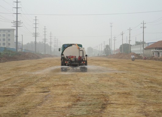 為保證工程質(zhì)量,項目部在水泥穩(wěn)定碎石基層攤鋪完成并壓實后立即在表層覆蓋草簾并灑水養(yǎng)護(hù),并連續(xù)三天灑水保持表面濕潤。施工現(xiàn)場還安排專人看護(hù),每天定時灑水養(yǎng)護(hù),禁止大型車輛通行。