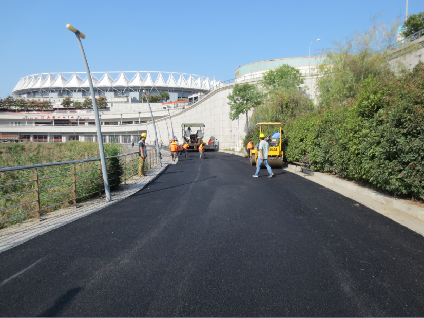 環(huán)湖路位于國信體育場游泳跳水館旁,道路全長625米,為體育場內(nèi)部主要道路之一?,F(xiàn)狀道路面層為3cm厚彩色強(qiáng)固混凝土,起砂、破損嚴(yán)重,嚴(yán)重影響行車舒適性。本工程為舊路綜合整治工程,設(shè)計(jì)將車行道舊彩色透水混凝土面層進(jìn)行銑刨,并鋪設(shè)3cm厚AC-10瀝青混凝土