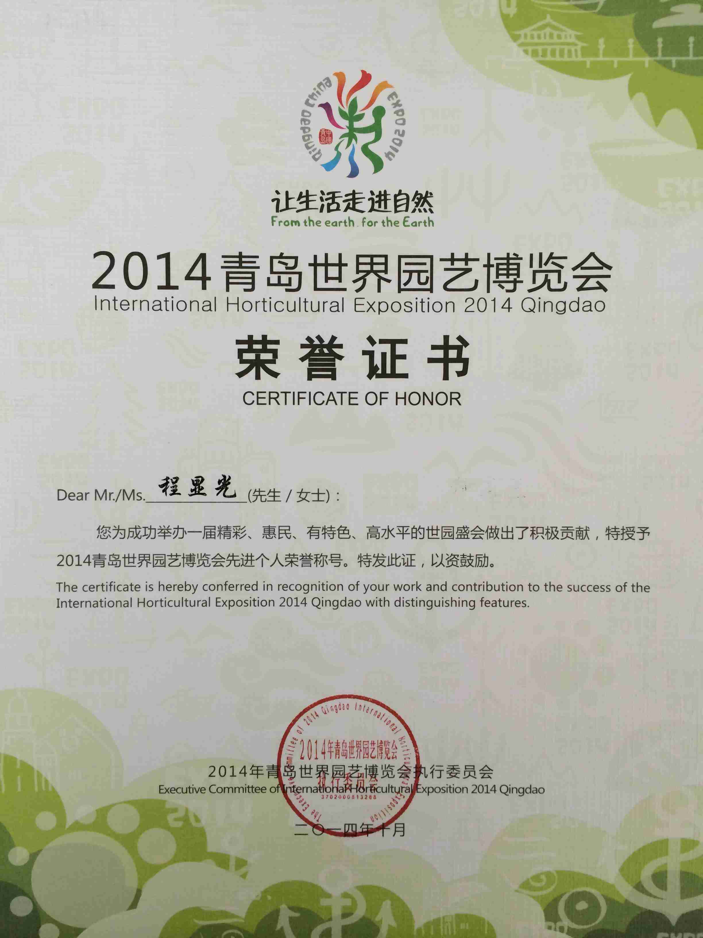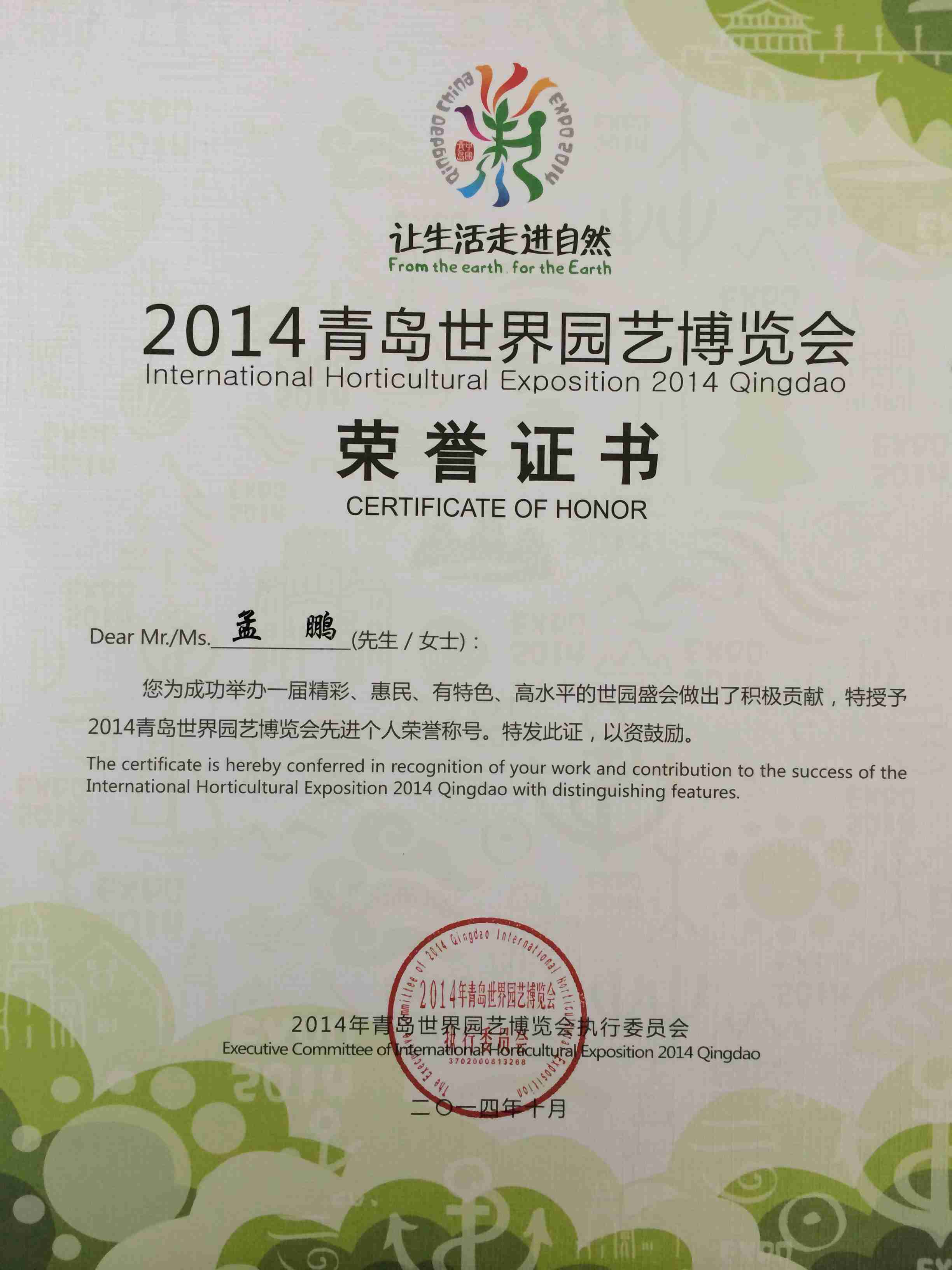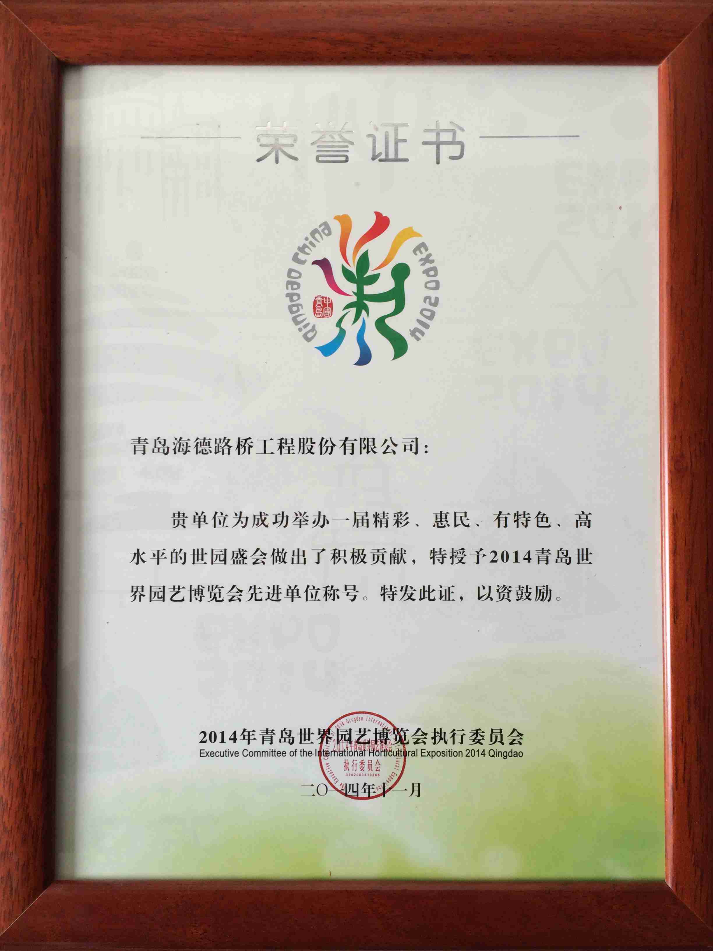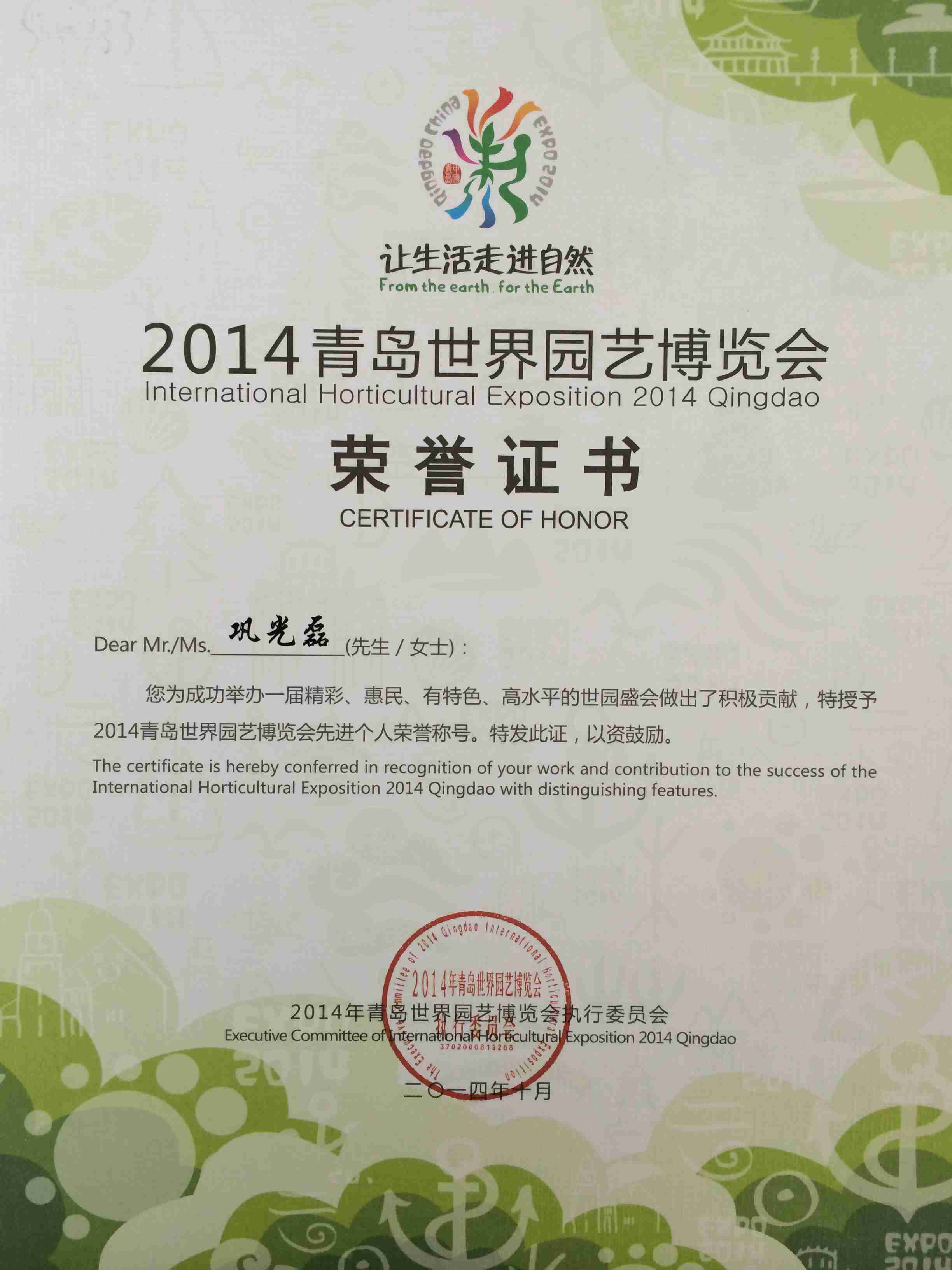 本次評選活動由2014年青島世界園藝博覽會執(zhí)行委員會主辦,表彰直接參與青島世園會籌建、招展和運營工作中作出積極貢獻的先進單位和先進個人。這兩個獎項的獲得是對我公司所做貢獻的充分肯定。