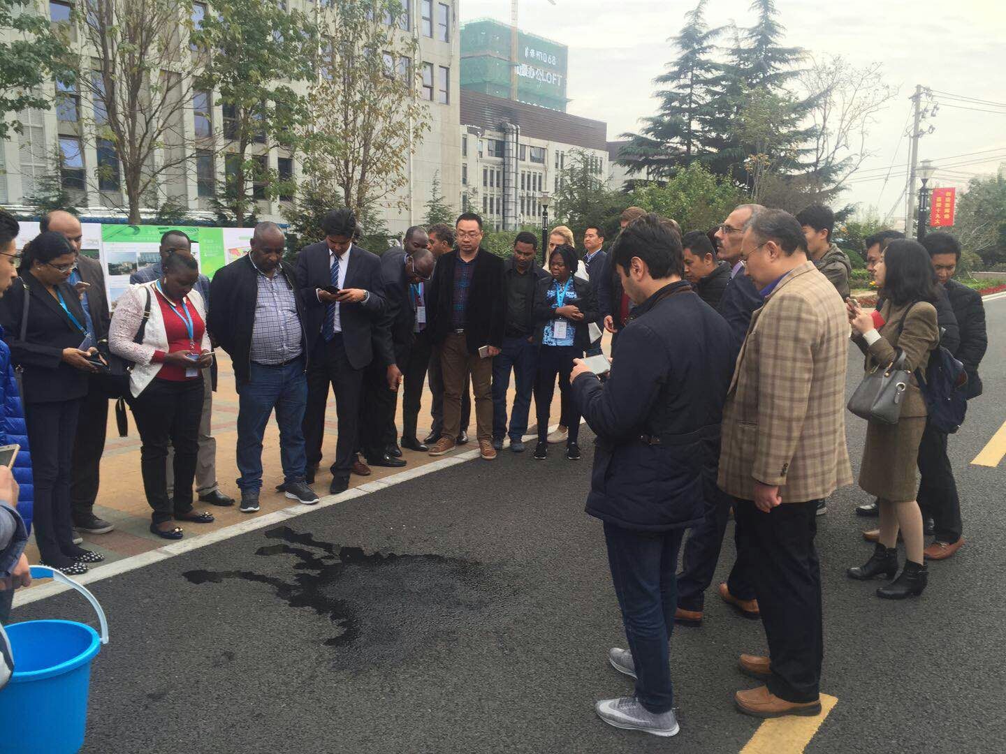 參觀國信體育場及李滄區(qū)委黨校海綿城市樣板工程現(xiàn)場圖片,圖為一分同事為官員們介紹工程并解答相關的技術問題。