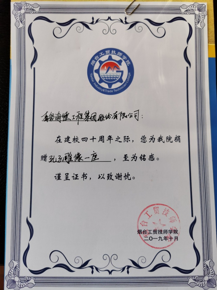2019年10月25日,值煙臺工貿(mào)技師學(xué)院迎來建校40周年暨國家級高技能人才培訓(xùn)基地揭牌儀式之際,集團(tuán)公司向煙臺工貿(mào)技師學(xué)院捐贈孔子雕像一座,以此表達(dá)對學(xué)院建校40周年的祝賀。煙臺工貿(mào)技師學(xué)院校領(lǐng)導(dǎo)、集團(tuán)公司煙臺分公司負(fù)責(zé)人參加捐贈儀式。