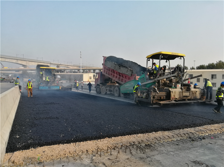 此次瀝青攤鋪施工范圍為主線路基段ZX200-300段底層瀝青攤鋪及主線橋ZX40-44段下面層瀝青施工,施工面積共計(jì)5200㎡。采用分幅全斷面攤鋪,施工作業(yè)人員準(zhǔn)確跟蹤瀝青運(yùn)輸車行駛軌跡和卸料時間等,確保瀝青料溫度在可控范圍之內(nèi),施工現(xiàn)場嚴(yán)格遵循“緊跟、慢壓、高頻、低幅”的工藝要求,把關(guān)瀝青混凝土的拌和、攤鋪、碾壓等各個環(huán)節(jié)。至當(dāng)日19時,首段主線瀝青攤鋪順利完成,為項(xiàng)目接下來開展大面積瀝青施工奠定了基礎(chǔ),拉開了主線瀝青面層施工大干的序幕。