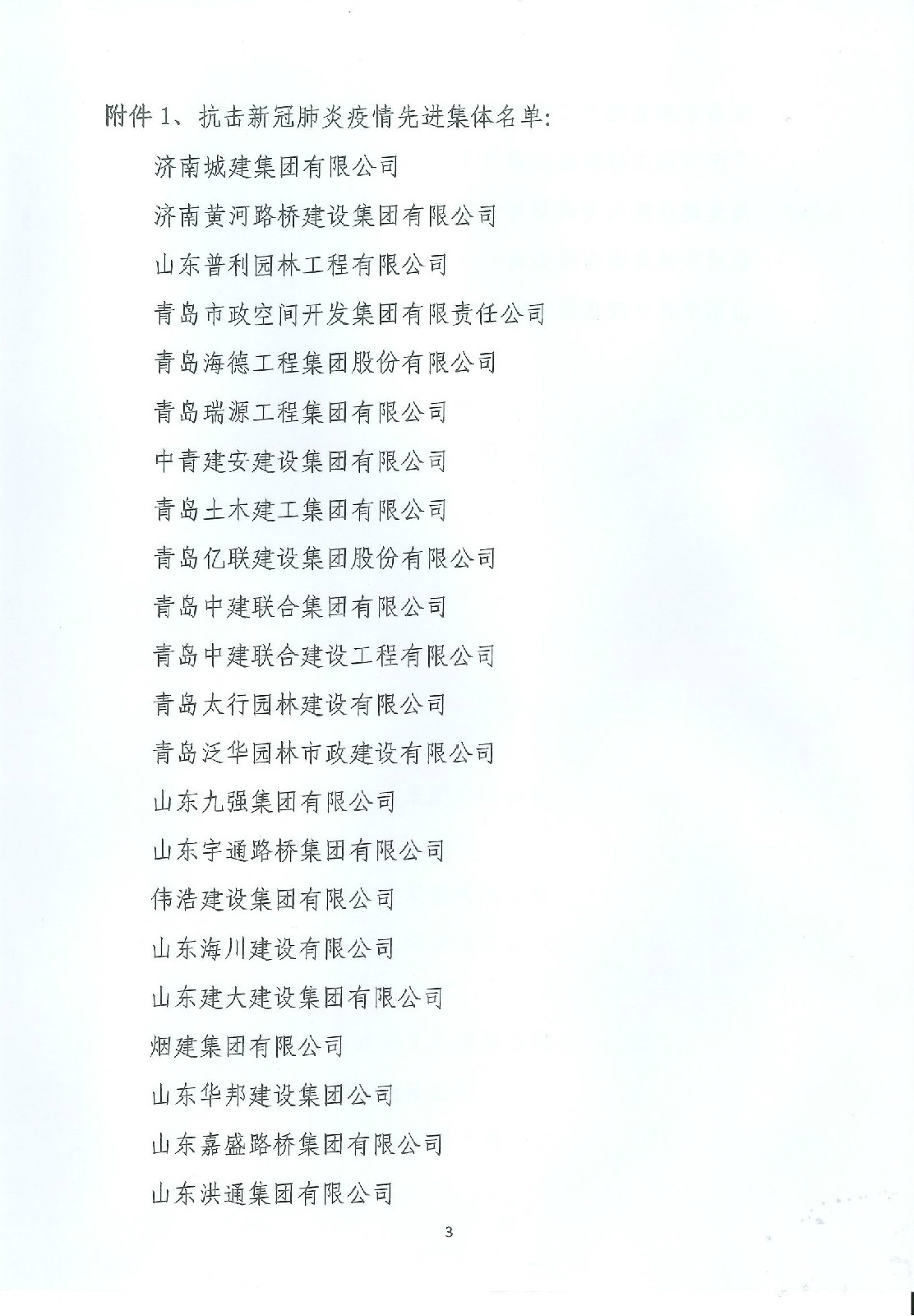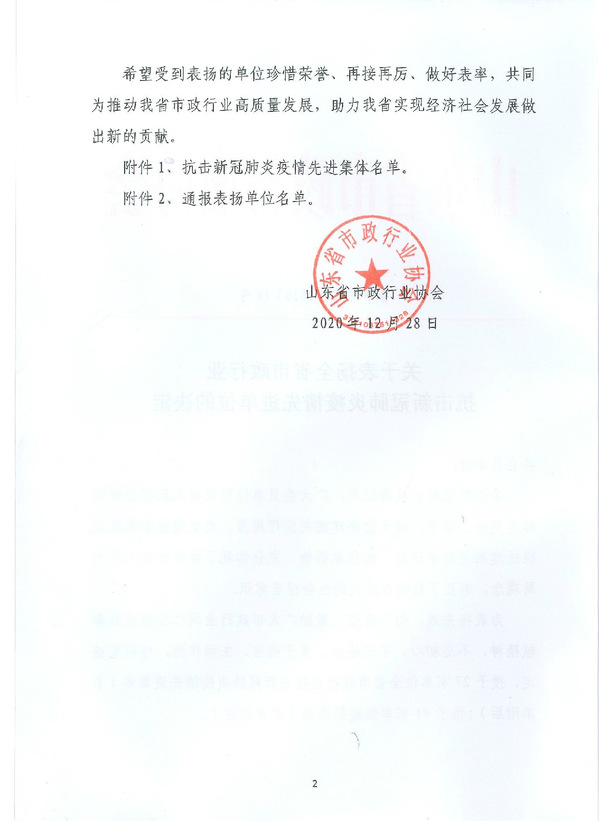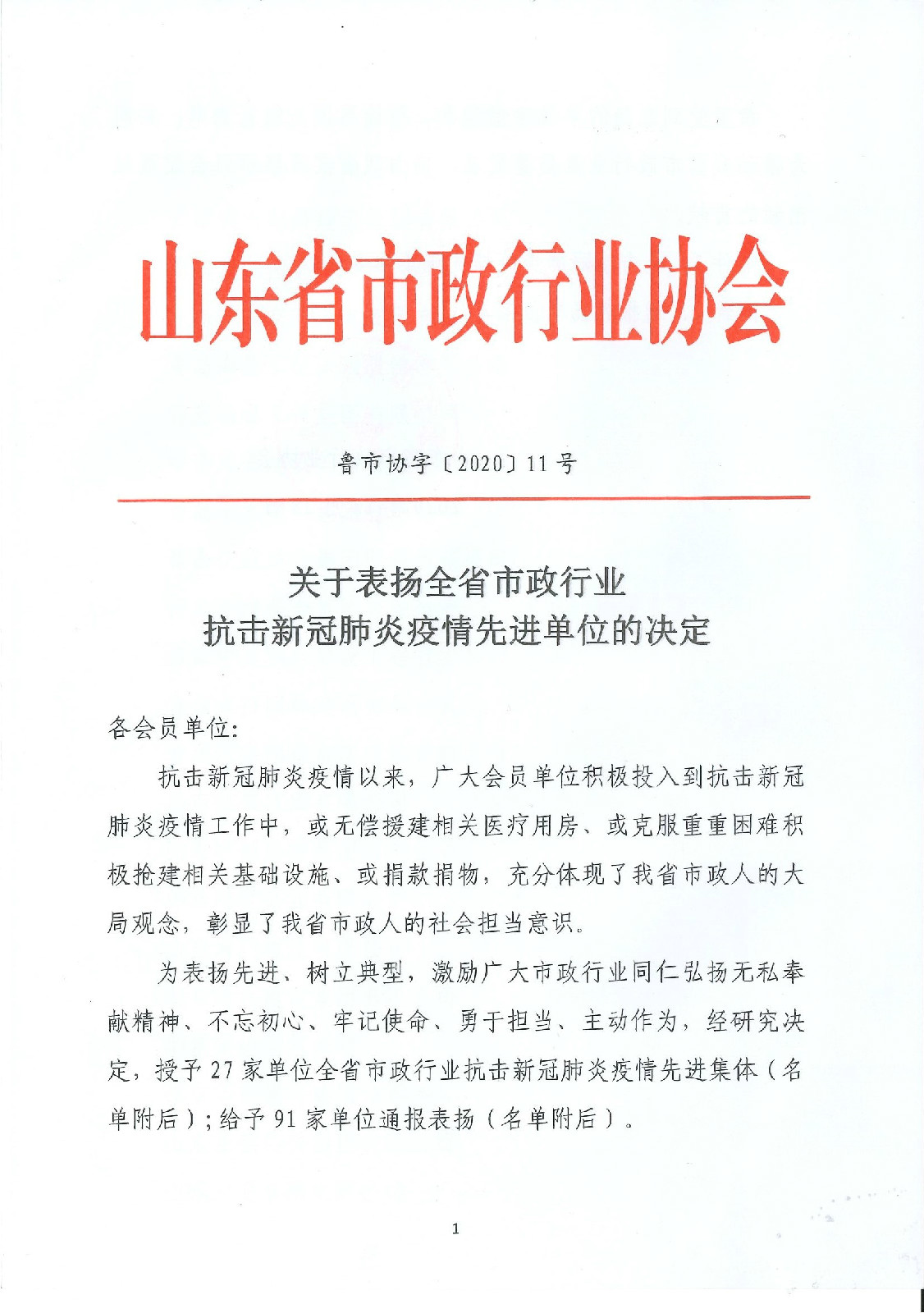 2020年12月28日,山東省市政行業(yè)協(xié)會(huì)印發(fā)《關(guān)于表?yè)P(yáng)全省市政行業(yè)抗擊新冠肺炎疫情先進(jìn)單位的決定》,集團(tuán)公司榮獲全省市政行業(yè)抗擊新冠肺炎疫情先進(jìn)集體稱(chēng)號(hào)。
