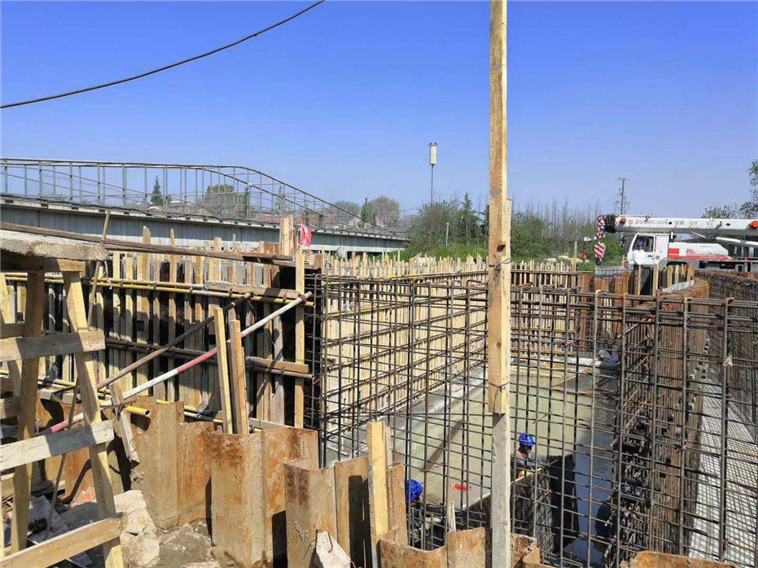 環(huán)灣路-長沙路立交橋工程現(xiàn)場(chǎng)施工人員進(jìn)行首根墩柱澆筑