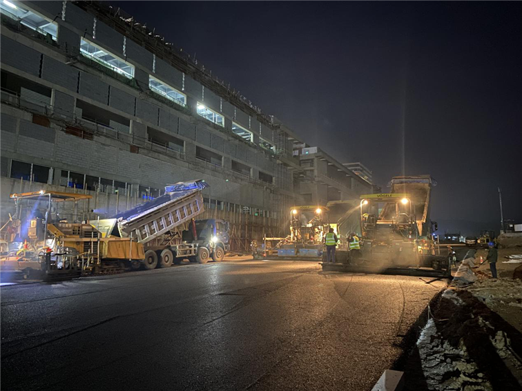 因項(xiàng)目施工過(guò)程中牽扯拆遷問(wèn)題較多,直至2021年11月21日才具備全面施工條件,因此項(xiàng)目工期壓力較大。項(xiàng)目部成員在集團(tuán)公司領(lǐng)導(dǎo)帶領(lǐng)下,秉持著“精工善筑,卓越海德”的精神,直面困難、積極應(yīng)對(duì),通過(guò)調(diào)整施工方案、合理調(diào)配施工資源、組織人員晝夜加班完成關(guān)鍵工序施工,克服冬期、夜間施工等困難,于2021年12月21日順利完成底層瀝青攤鋪任務(wù)。
