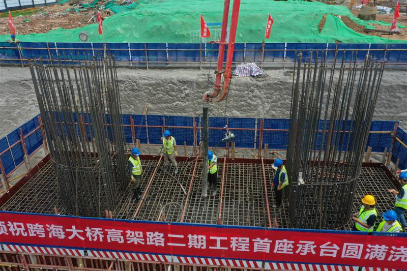 2022年7月28日上午10點,由集團承建的跨海大橋高架路二期工程一標(biāo)段首個承臺開始澆筑,混凝土順著泵車曲折綿長的泵送管道連續(xù)灌入密密匝匝的承臺鋼筋骨架之間,歷時3個小時,工程首個承臺順利澆筑完成,標(biāo)志著工程施工進入全面提速階段。