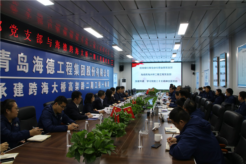 2022年12月5日下午,青島海德工程集團跨海大橋二期工程臨時黨支部與招商銀行青島分行營業(yè)部黨支部在海德集團跨海大橋高架路二期工程項目部會議室聯合開展“黨建共建”、“學習貫徹黨的二十大精神”主題黨日活動。黨的二十大代表、招商銀行青島嶗山支行大堂主管王瑾敏,嶗山區(qū)工信局機關黨委副書記董元波,招商銀行青島分行黨委委員、副行長侯登峰,營業(yè)部黨支部書記柳宏,海德集團黨總支書記、董事長鞏光磊,黨總支副書記、副總裁呂同占,大橋項目部臨時黨支部書記孫成山,黨支部全體黨員、預備黨員、入黨積極分子等共同參加了此次活動。海德集團黨總支副書記、副總裁呂同占主持活動。