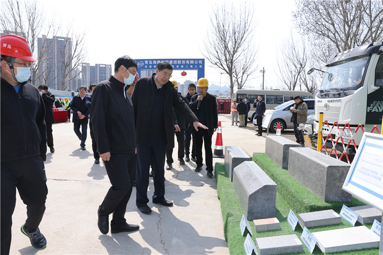 王玉志廳長一行參觀了跨海大橋項(xiàng)目部,詳細(xì)了解了集團(tuán)公司的發(fā)展歷程、產(chǎn)業(yè)布局及項(xiàng)目業(yè)績。集團(tuán)董事長鞏光磊代表公司對(duì)王玉志廳長一行的到來表示熱烈的歡迎,對(duì)跨海大橋項(xiàng)目的施工情況作了詳細(xì)匯報(bào)并著重介紹了集團(tuán)全資子公司海德信達(dá)新型材料科技有限公司投資建設(shè)的市政裝配式構(gòu)件項(xiàng)目。王廳長對(duì)項(xiàng)目建設(shè)、海德信達(dá)生產(chǎn)仿真路沿石市政工程新材料、新工藝等給予高度評(píng)價(jià)。