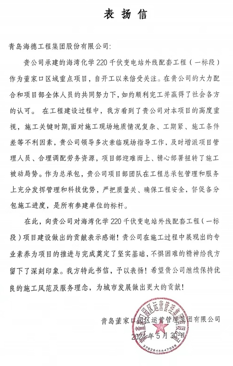 近日,集團(tuán)承建的海灣化學(xué)220kv變電站外線配套工程(一標(biāo)段)順利完工,為該區(qū)域基礎(chǔ)設(shè)施建設(shè)再添一座新的里程碑,建設(shè)單位特此發(fā)來表?yè)P(yáng)信,對(duì)集團(tuán)和項(xiàng)目部的工作表示肯定和表?yè)P(yáng)。