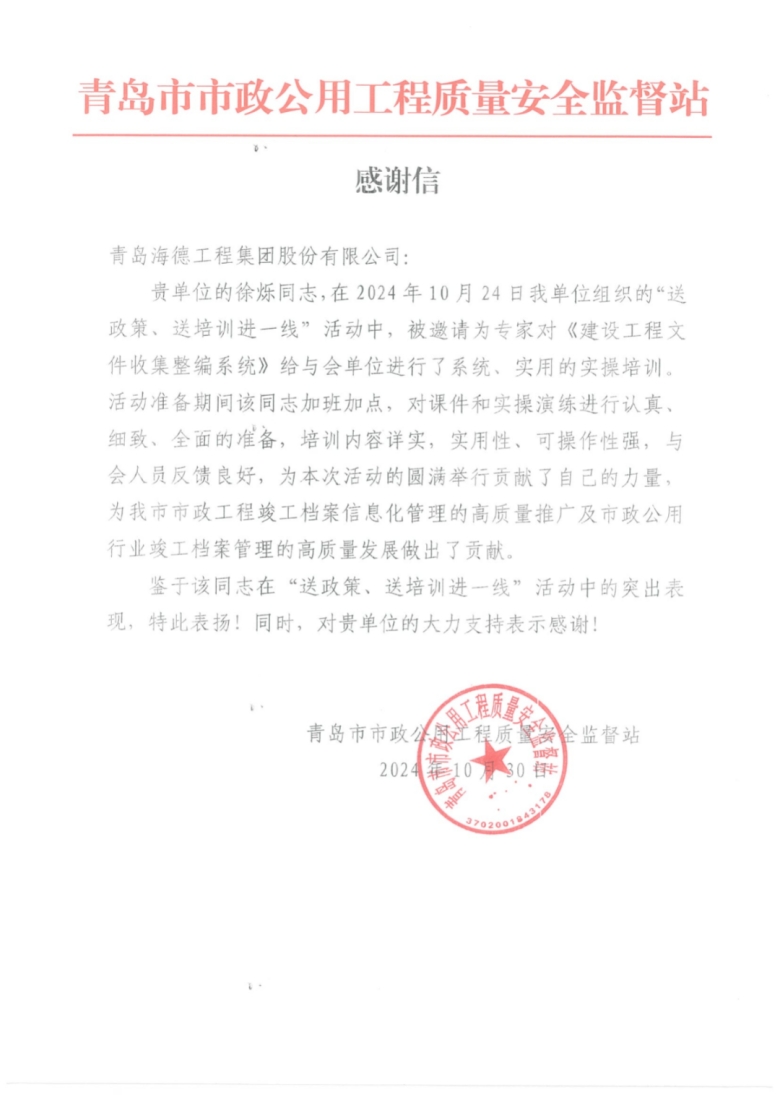 2024年10月30日,青島市市政公用工程質(zhì)量安全監(jiān)督站向集團(tuán)發(fā)來(lái)表?yè)P(yáng)信,對(duì)于我集團(tuán)員工徐爍在“送政策、送培訓(xùn)進(jìn)一線”活動(dòng)中的突出表現(xiàn)給予表?yè)P(yáng),對(duì)于集團(tuán)對(duì)活動(dòng)的大力支持表示感謝。