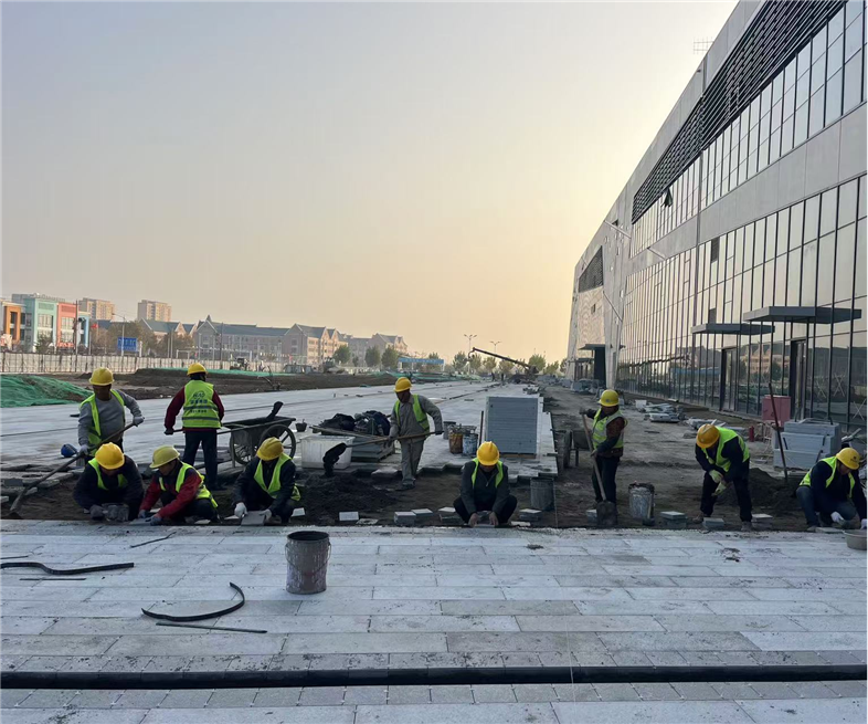 宿豫電商園區(qū)附屬配套工程施工內容涵蓋道路、管網(wǎng)、鋪裝、塑膠場地、綠化、水景、小品、景觀照明等方面。自7月初進場,項目部全體人員齊心協(xié)力推進項目有序開展,并在勞務管理方面設置專員,確保工人工資發(fā)放到位。場地空間的局限、雨季的干擾以及交叉施工的復雜性,都未能阻擋工程的進度。經(jīng)過不懈努力,10月底項目所有地下管網(wǎng)施工全部完工,11月場地整平、廣場鋪裝等工作大面積展開。