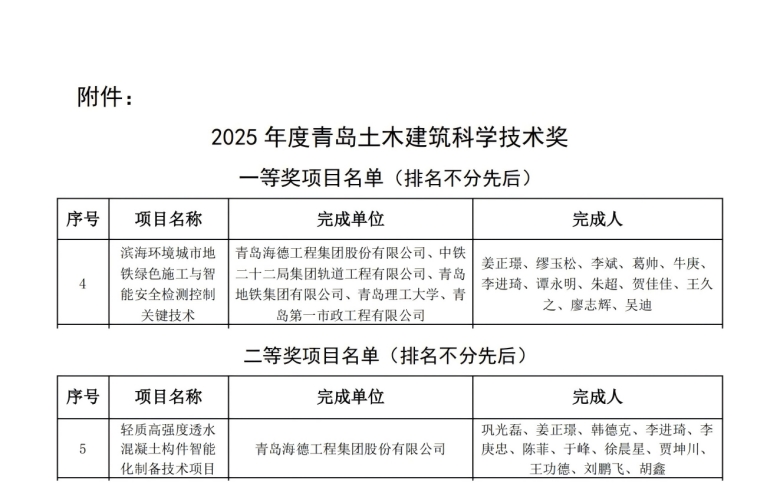 6月6日,青島市土木建筑工程學會發(fā)布了關于“2025年度青島土木建筑科學技術獎”授獎項目的公告,共授予青島土木建筑科學技術獎20項,其中一等獎5項、二等獎7項、三等獎8項。集團申報的“濱海環(huán)境城市地鐵綠色施工與智能安全檢測控制關鍵技術”獲一等獎,“輕質(zhì)高強度透水混凝土構件智能化制備技術”獲二等獎。