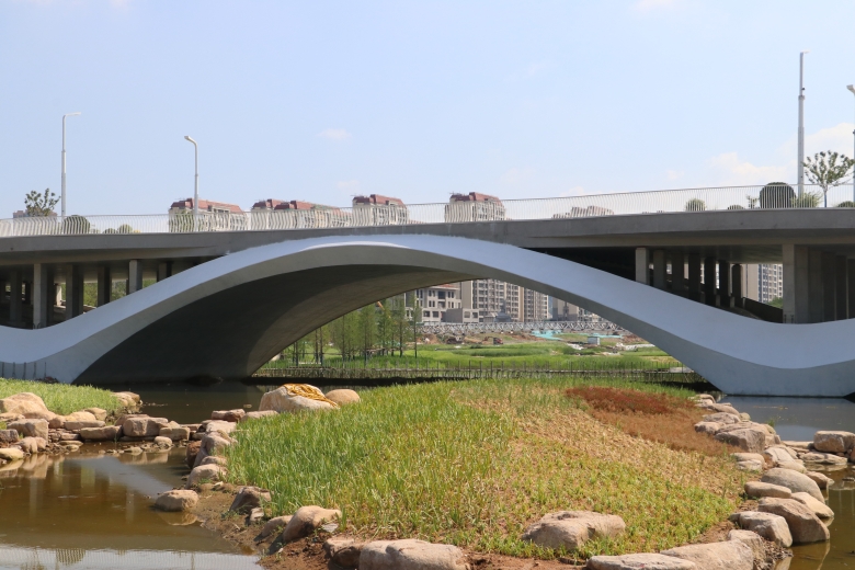 張村河瑤海路橋項(xiàng)目南起科技園一路,北至規(guī)劃十三號(hào)線,全長115米,主跨徑50米,是青島市跨徑最大的現(xiàn)澆混凝土箱型拱橋。其設(shè)計(jì)靈感源于“水波蕩起的漣漪”,中跨拱座上方巧妙設(shè)置4個(gè)觀景平臺(tái),而拱圈側(cè)面為獨(dú)特的異形混凝土及鋁板漣漪造型。