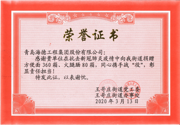 集團(tuán)董事長鞏光磊在得知王哥莊街道社區(qū)防控一線人員加班加點(diǎn)為周邊居民做好防控吃飯不便的情況下,迅速采購物資,為王哥莊街道送去360箱方便面、80箱火腿腸作為后勤保障。集團(tuán)一直熱心公益事業(yè),自新型冠狀病毒感染肺炎疫情發(fā)生后,集團(tuán)、各分支機(jī)構(gòu)及所有員工都伸出援助之手抗擊疫情,已向嶗山區(qū)紅十字會(huì)、嶗山區(qū)沙子口街道、膠州區(qū)李哥莊、王哥莊街道等多地捐款捐物,攜手戰(zhàn)“疫”彰顯海德責(zé)任擔(dān)當(dāng)。