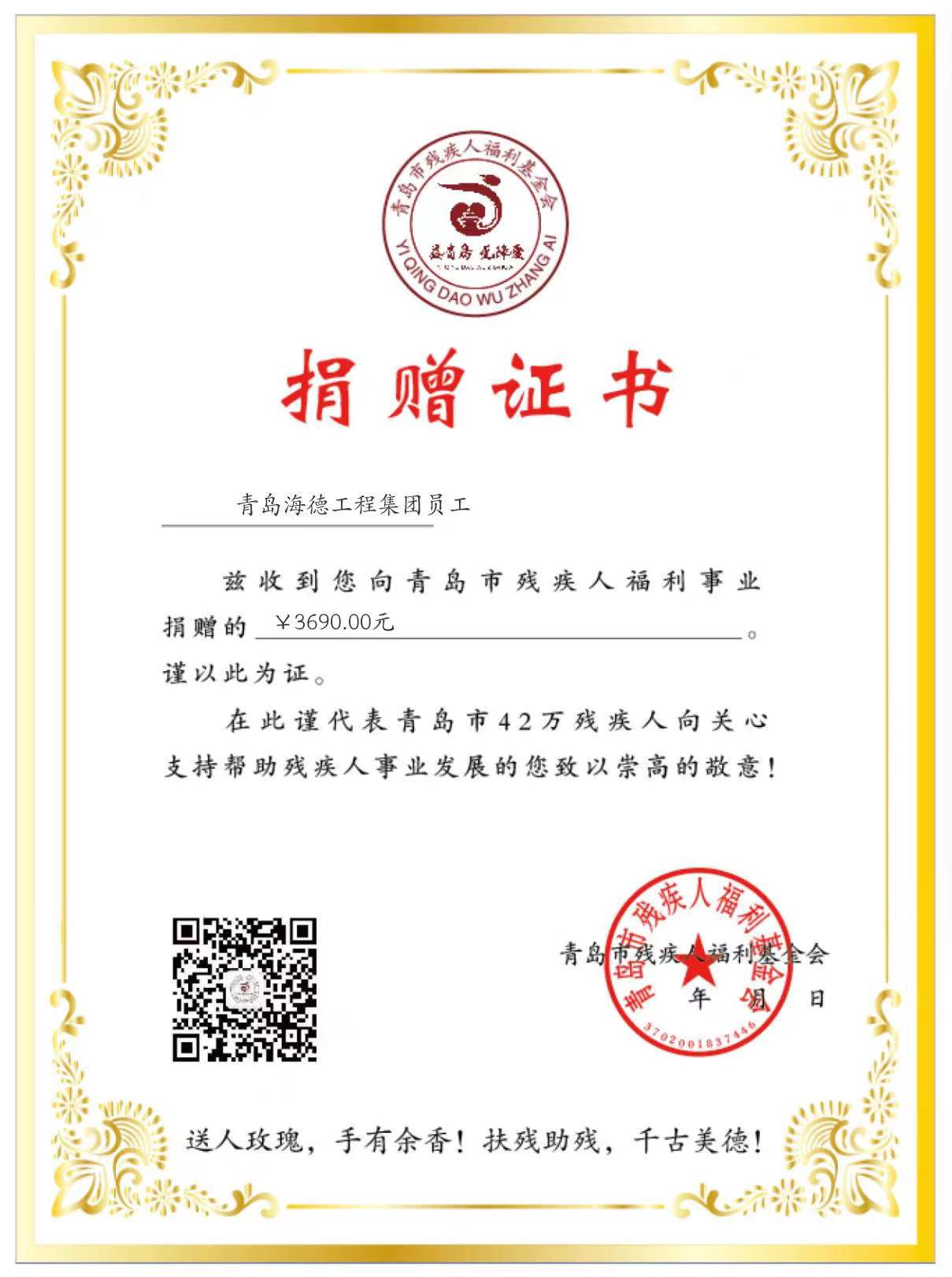 在新年到來之際,在辭舊迎新的歲月里,剛脫離貧困的殘疾人兄弟姐妹們仍然面臨著一些現(xiàn)實困難。為幫助殘疾人過一個歡樂祥和的新年,青島市殘疾人福利基金會發(fā)起了“我捐一點錢,幫助殘疾人迎新年”活動,募捐款項將全部用于幫扶殘疾人解決日常生活、信息交流等方面的困難?;顒影l(fā)起后,集團公司積極響應號召,組織發(fā)動員工捐款,共募得款項3690元。